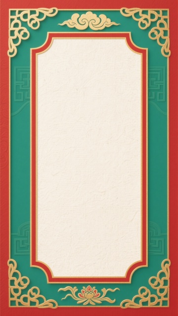 国潮风格背景,以正红色为主色调,搭配金色描边和青蓝色装饰块,整体呈现出喜庆、典雅的氛围。画面中央为大面积留白区域,四周有传统中式边框装饰,右上角点缀盛开的红色花朵图案,左下角有一个圆形红色元素,底部有青蓝色的波浪形装饰条,所有元素边缘均有精致的金色线条勾勒,色彩鲜明对比强烈,具有浓厚的中国传统节日气息和现代设计感,构图对称平衡,留白充足,视觉层级清晰,营造出庄重而不失灵动的国潮视觉效果。