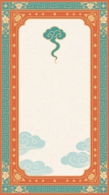 中国传统国风背景,改变原红色调为以淡雅青绿色为主,搭配米白色祥云,大面积留白的构图,画面中装饰有传统云纹和水波纹图案,线条流畅细腻,具有古典雅致的韵味,整体风格清新淡雅,留白处营造出空灵悠远的意境,青绿色与米白色形成和谐的色彩搭配,传统纹样在留白的衬托下更显精致,具有浓厚的东方美学气息。