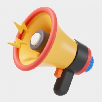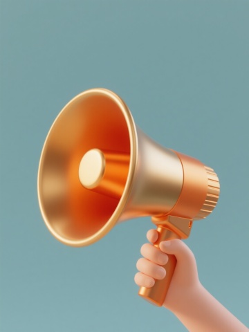 简约现代风格的3D立体图标,纯色背景,画面中央为一只卡通风格的手握着一个造型规整的喇叭,喇叭和手部采用圆润的几何造型,边缘平滑无棱角,整体色彩明快鲜艳,具有轻微的渐变和高光质感,无任何文字、logo和水印。