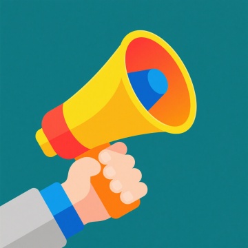 扁平化风格设计的警示图标素材,一只握着黄色橙色渐变扩音器的手,喇叭口有蓝色圆形发声装置,喇叭边缘有黄色高光,手部为浅肤色,袖口为蓝色和灰色,背景简洁,可尝试红色系、蓝色系、绿色系等不同配色方案,保持简洁明了的视觉效果和警示传达功能