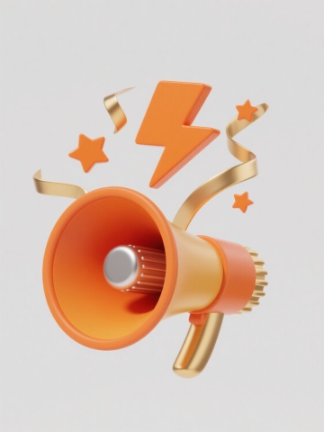 3D立体风格的促销造型图案,主体为一个橙色渐变喇叭,喇叭口内侧和喇叭柄为金色,喇叭中心有银色金属质感的发声部件,喇叭上方有一个橙色闪电形状装饰,周围点缀着橙色星星和金色飘带,整体造型简约现代,采用纯白色纯色背景,图案规整排布,具有现代促销设计感。