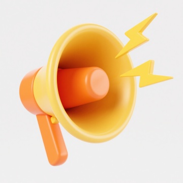 3D风格的警示图标,主体为黄色扩音器,带有橙色渐变和光滑的塑料质感,右侧有两个黄色闪电符号从喇叭口发出,简洁的造型和鲜明的色彩对比营造出醒目、警示的氛围,适合用于传达重要提示或警告信息,白色背景使图标更加突出,具有现代设计感和高效的信息传达能力。