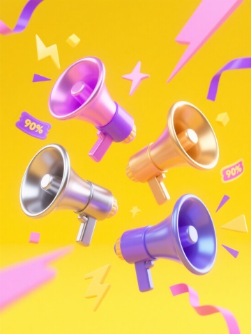 画面中心是一只手拿着一个大大的喇叭,喇叭上有冒出一个对话框,里面写着“折扣!”,点缀彩带,四周围绕着几个星星,黄色背景。