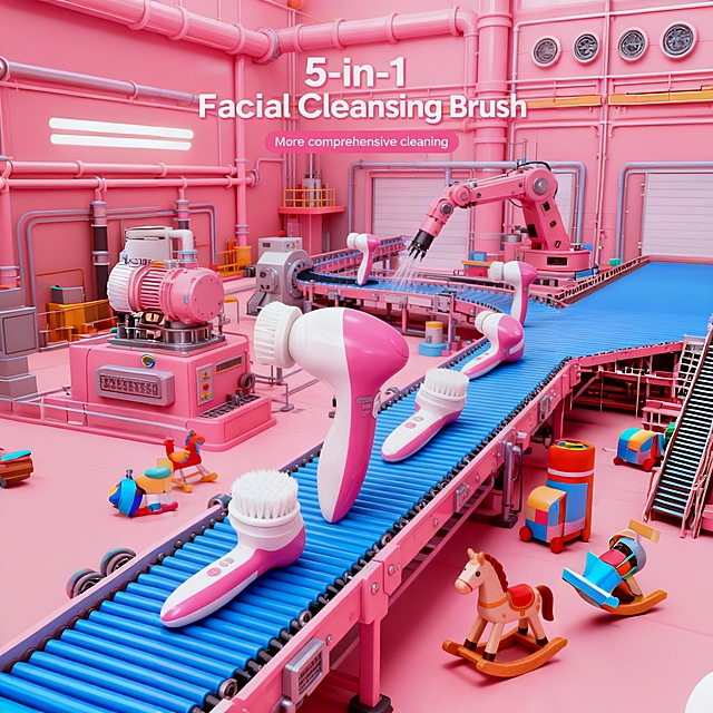 美妆微缩工厂 整体粉白色调。车间里,一群流水线员工在制作一支巨大的美妆刷,有的在修剪刷毛,有的在擦拭,有的在梳刷毛,有的在洗毛巾;环境明亮干简洁。