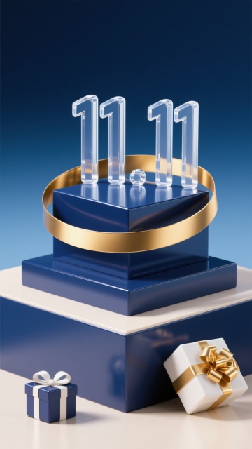 画面以复古金色花纹的暗棕背景为底,中心是一个带有浮雕花纹的复古红丝绒化妆品礼盒(盒盖微微开启),礼盒内摆放着参考图产品,深红色丝绒丝带优雅地打了个蝴蝶结环绕礼盒,礼盒上印有醒目的 “11.11”几个字,整体营造出老上海复古奢华的美妆氛围。