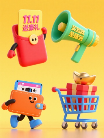 软3D风格的拟人化购物元素,萌趣十足,搭配鲜艳色彩与塑料质感,传递双11促销狂欢的可爱与趣味感。