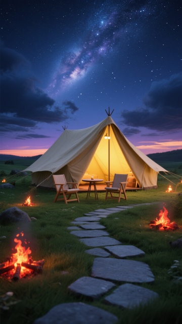 清新自然的秋日露营场景,融合温馨灯光与绿意草坪,大字风标题搭配手绘花朵,营造文艺梦幻氛围,实景感十足,杂志风排版传递舒适惬意的秋日探索体验。