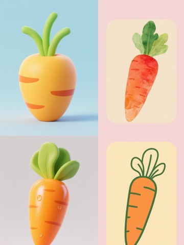 一组4个完全不同风格的胡萝卜系列素材集合,规整排布在纯色背景上。第一个胡萝卜为扁平卡通风格,造型圆润,身体呈橙黄色,带有深橙色条纹,绿色的叶子向上伸展,背景为浅蓝色;第二个胡萝卜是水彩手绘风格,造型自然,身体呈橙红色,带有水痕纹理,绿色叶子边缘模糊,背景为浅粉色;第三个胡萝卜是3D立体风格,造型逼真,身体呈橙黄色,表面有光泽和水滴,绿色叶子有层次感,背景为浅灰色;第四个胡萝卜是极简线条风格,造型简约,身体呈橙色,用线条勾勒轮廓,绿色叶子为线条组合,背景为浅黄色。所有胡萝卜均保持胡萝卜的基本元素内容,画面整体色彩变换,风格各异,整齐排列。
