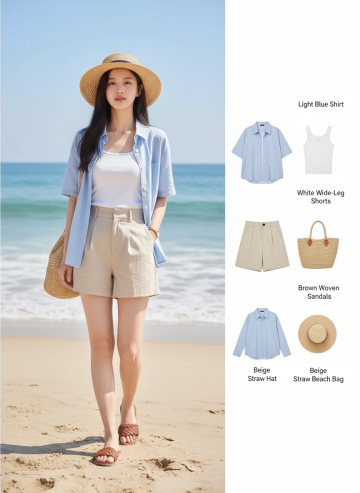 一位女性模特穿搭展示,身着白色短袖翻领衬衫,衬衫有胸前口袋和纽扣设计,搭配黑色中长款A字半身裙,脚穿米色运动鞋和白色中筒袜,右手自然下垂拿着一个棕色布面包袋,左手插在裙兜里,整体姿态自然放松。画面采用简约写实风格,背景为浅灰色纯色,光线柔和均匀,呈现出舒适、日常的穿搭氛围,色彩以黑白棕为主色调,和谐统一,突出服装的剪裁和质感。