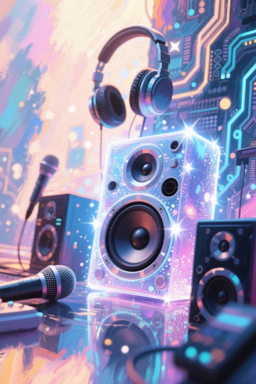 赛博朋克风的未来音乐场景,霓虹灯效与科技感音箱交织,展现酷炫机能美学。