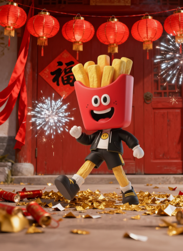 3D卡通薯条拟人形象,国潮风设计,喜庆烟花背景,节日氛围浓厚。
