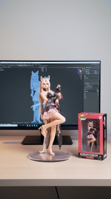 将这个图片制作成一个商业化1/7比例手办,风格写实,环境逼真。手办放置在电脑桌上,配有一个圆形透明亚克力底座,底座上没有文字。电脑屏幕上显示着手办的Zbrush建模过程。电脑屏幕旁边是一个万代风格的透明玩具盒,上面印有原始画作。