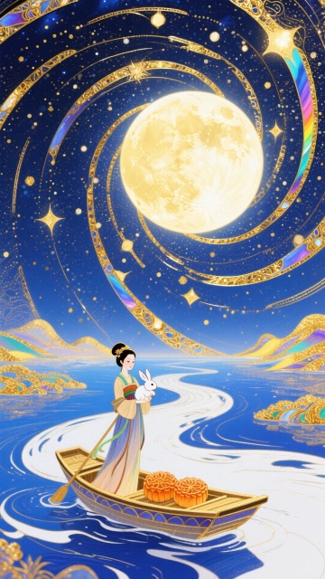 古典雅致风格,全景,嫦娥抱着白色玉兔飞向空中,衣裙随风飘动着,图上三分之一处中央有一个巨大发光满月(金银色为主),围绕满月向四周扩散成旋涡的星空(银白色金色交织) ,星空河流世界,河流中飘着几只金色小船(船中叠放这黄色月饼),梦幻感奇异,色彩以深邃蓝、暖黄为主,搭配金色点缀