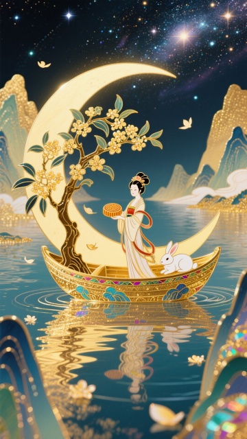 梦幻般的中秋夜,嫦娥泛舟于星河之上,手持玉兔,船载月饼。鎏金纹饰与水彩晕染交织,国潮风韵中透出唯美浪漫,超现实主义构图尽显东方诗意。