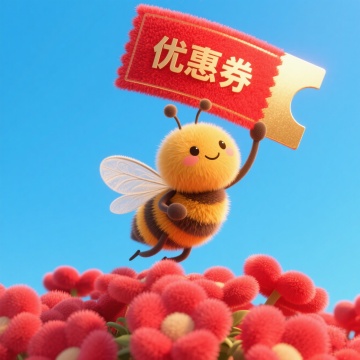 软3D风格,拟人化小蜜蜂簇拥红色优惠券,毛发生长质感萌趣十足,搭配鲜艳花朵与蓝天,营造出卡通感十足的喜庆促销氛围。