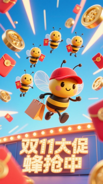 主视觉为带着红帽子的蜜蜂提着购物袋冲出画面,背后跟着3只拿着红包袋的小蜜蜂,正面视角,背景金币、红包、放射线点缀,画面下方为3D文字灯牌“双11大促 蜂抢中”