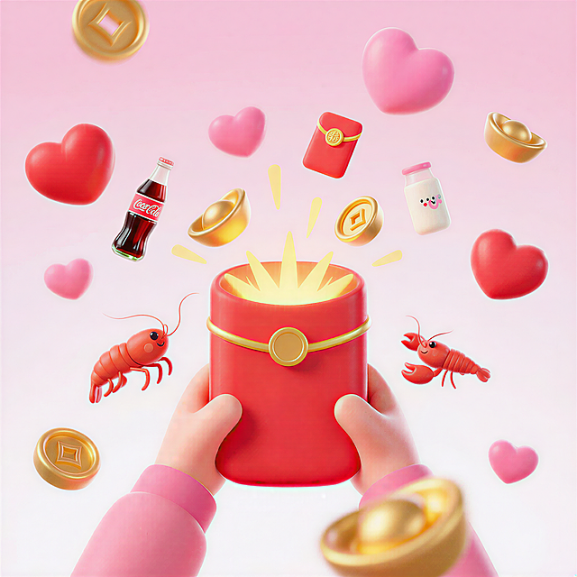 软3D风设计,红色礼盒溢出红包与金币,营造浓厚喜庆感,适合节日庆祝。详情