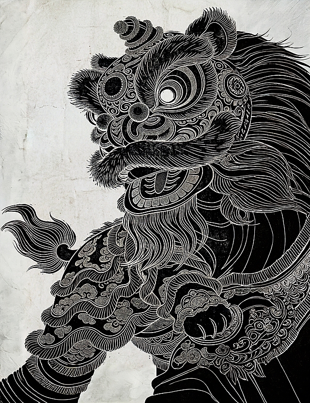 帮我生成34×40的比例的新年国风插画,舞狮元素详情