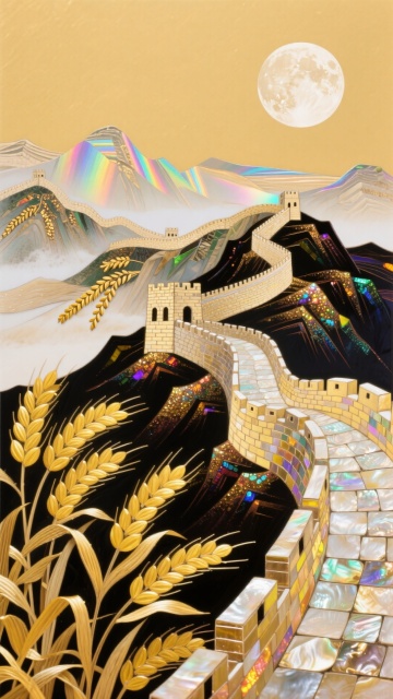 画面仿制麦秆画工艺,利用麦秆天然的色泽和光泽进行拼贴。近景是金黄色的麦穗(丰收致敬国庆),中景是蜿蜒的长城,远景是一轮由浅色麦秆拼贴出的明月。麦秆的天然纹理赋予山河独特的肌理感,整体色调温暖质朴,寓意国基永固,岁物丰成。