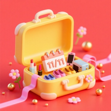 3D重拟物风格的充气数字“11.11”悬浮于空中,搭配金属质感红包与金币,营造出喜庆热烈的双十一大促氛围。