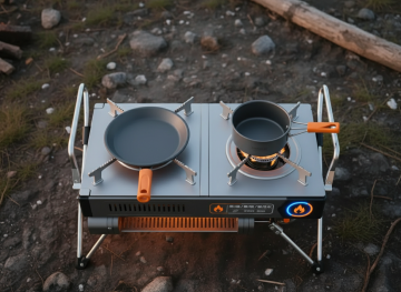 工业风户外灶具,金属质感搭配橙色点缀,科技感火焰显示与光影交织,展现现代机能美学与质朴野营场景的融合。