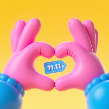 软3D风卡通双手比耶,手持充气感“11.11”票券,糖果色系搭配波普艺术元素,甜蜜可爱,引爆双11狂欢氛围。