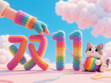 梦幻感与可爱感交织的软3D风格,彩虹毛线编织“双11”字样,拟人猫咪手抱毛线球,刺绣风细节与毛发生长质感呼应,营造双11童趣节日氛围。