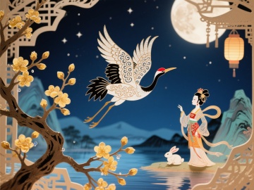 前景设苍劲桂花枝,虬曲枝干缀满金灿花苞与半绽花瓣,夜露凝于瓣尖泛微光,枝桠交错遮半幅画面,添自然野趣。画面核心是皮影风格的瑞鹤,羽间镂刻云纹、回纹等中式纹样,朱红喙、玄黑翅,双翅舒展似拂星河,轻盈悬浮于墨蓝夜空。夜空缀疏星与宫灯虚影,光影对比强烈,构图斜向延伸破常规,皮影边缘泛朦胧光晕,整体飘逸灵动,满含中式浪漫。增加有山有水,有嫦娥和月兔,以嫦娥为主体