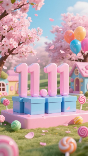 核心是“11月11日购物节” 的金色魔法字体(带星光特效),置于粉色糖果色的魔法城堡阶梯展台(红色与粉色结合,有糖霜质感)。背景是卡通童话森林、会飞的魔法礼盒(带翅膀)、彩虹彩带、闪着星光的金币、棉花糖云朵、动物形状气球,整体风格梦幻童话,突出双十一童话魔法购物狂欢氛围。