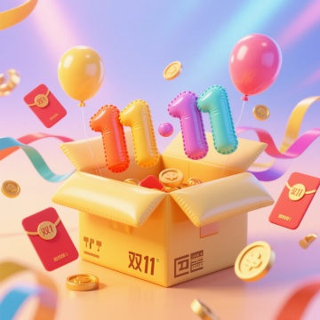 软3D风卡通场景,融合轻拟物与粘土质感,梦幻森林中帐篷与礼物盒营造喜庆氛围,金币飘浮呼应双十一购物狂欢主题。