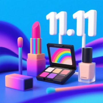 画面以马卡龙粉蓝渐变的背景为主,中心是一个卡通感十足的彩色积木造型礼盒,盒里面躺着参考图产品,前面一个小木牌刻有“11.11” 字样,整体营造出活力、可爱、充满青春气息的美妆氛围。