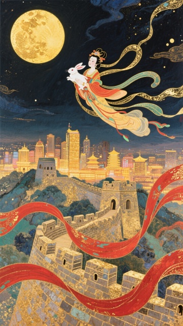 梦幻唯美插画风,中式古典与国潮融合,嫦娥飞天于金月之下,彩带飘逸如刺绣般精致,长城蜿蜒,玉兔相伴,鎏金质感尽显中秋雅韵。
