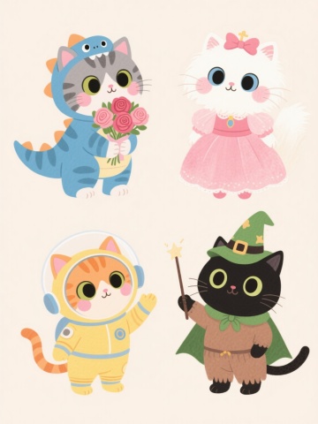 一组由6只不同品种猫咪组成的集合插画,每只猫咪均佩戴具有创意针织质感的特色帽子,整体采用简约纯色背景,保持温暖治愈的萌系风格,画面色彩变换丰富且每只猫咪拥有独特配色方案,猫咪面部表情生动,眼睛明亮有神,脸颊带有自然红晕,整体构图规整排布,呈现出清晰的视觉层次和统一的设计感,细节精致,光影柔和,营造出可爱温馨的氛围。
