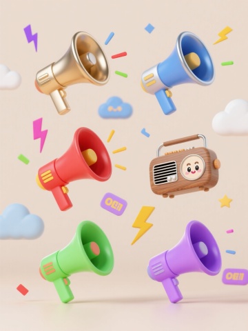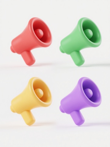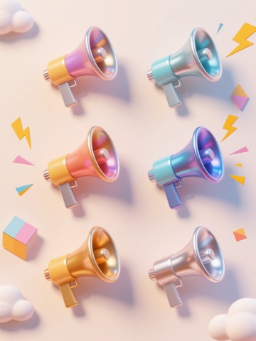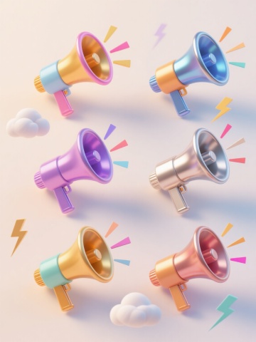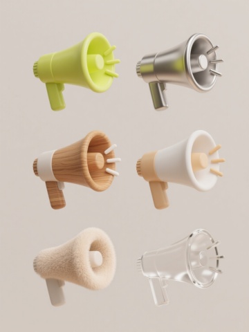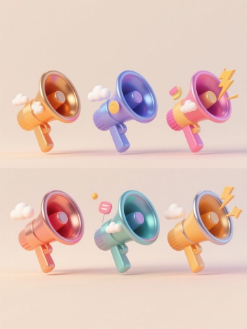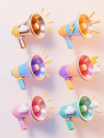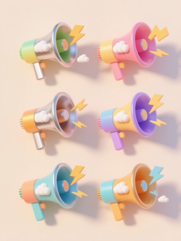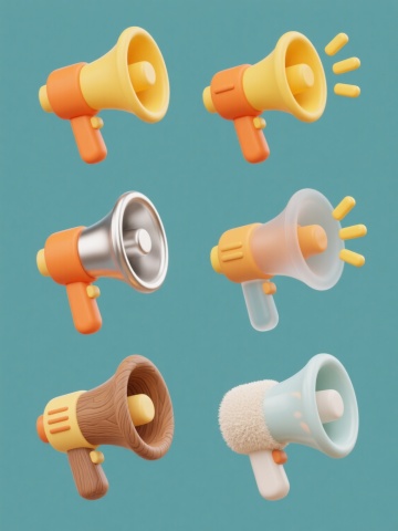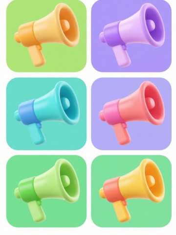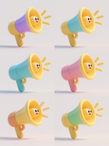一套6张系列素材集合,每张素材均为规整排布的单一元素图案,保持简约现代的3D卡通风格,采用纯色背景,无任何文字、logo及水印。整体造型圆润可爱,具有光滑的塑料质感和柔和的光影效果,高光与阴影过渡自然,物体边缘有轻微的模糊处理以增强立体感。每张素材中改变喇叭的造型设计和颜色,喇叭主体为不同颜色的圆润扩音筒,搭配黄色的喇叭嘴和手柄,带有卡通化的眼睛和表情,以及黄色的声波线条从喇叭口向外扩散,保持统一的构图和视觉风格。