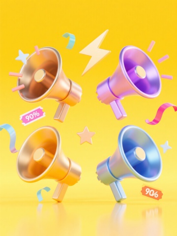 4个不同配色、不同样式、不同材质的喇叭造型,黄色背景,每个喇叭具有金属质感的渐变色彩,高光和阴影细节丰富,表面光滑有光泽,周围点缀着几何形状的闪电、星星、彩带、优惠卷装饰元素,整体构图均衡,营造出欢快、活泼的促销氛围,视觉层级清晰,信息传达高效,符合现代促销海报的设计感