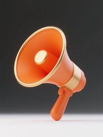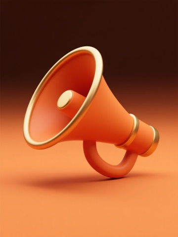 3D立体风格的促销造型图案,主体为一个橙色渐变喇叭,喇叭口内侧和喇叭柄为金色,喇叭中心有银色金属质感的发声部件,喇叭上方有一个橙色闪电形状装饰,周围点缀着橙色星星和金色飘带,整体造型简约现代,采用纯白色纯色背景,图案规整排布,具有现代促销设计感。