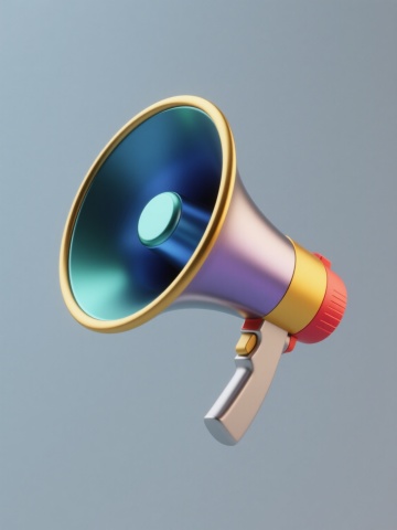 简约现代风格,纯色背景,无文字无logo无水印,居中规整排布单一元素图案,一个具有金属质感的喇叭造型设计,喇叭主体为[此处可替换为不同颜色,如蓝色、绿色、黄色、紫色、红色、灰色等],喇叭边缘和手柄处有金色渐变高光装饰,喇叭口呈圆润的扩音器形状,手柄设计简洁有弧度,整体造型光滑流畅,光影效果为柔和的侧上方光源,形成轻微的明暗对比和立体感。