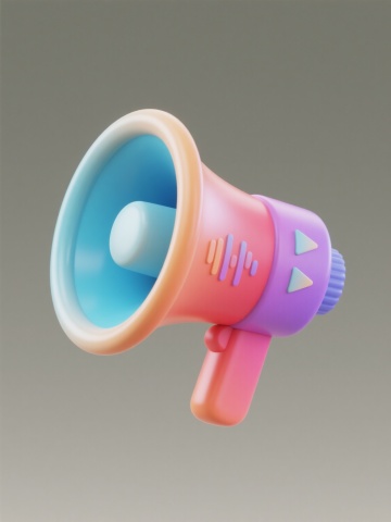 简约现代风格3D图标,单个喇叭元素居中规整排布,喇叭造型设计独特,主体为鲜艳的[可替换颜色],喇叭开口边缘和手柄为[可替换颜色],喇叭口内侧为[可替换颜色],侧边有三个渐变的[可替换颜色]三角形声波图案,纯色背景,无文字,无logo,无水印,整体造型圆润简洁,具有光滑的塑料质感,光影柔和,立体感强。