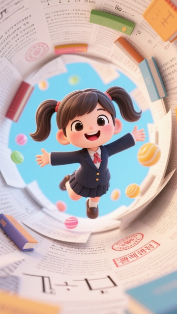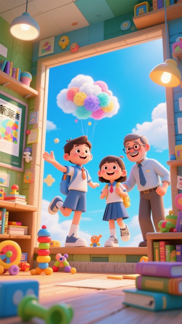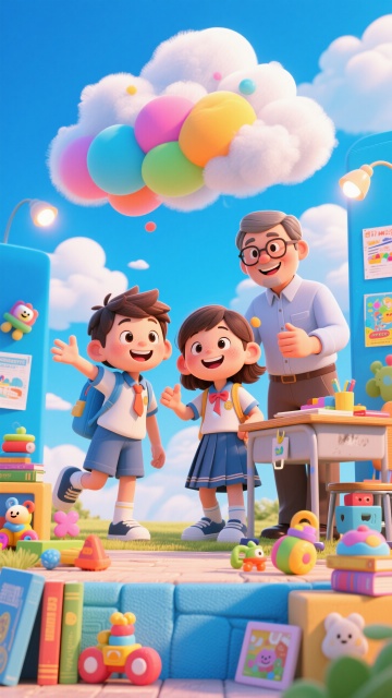 软3D风卡通设计,可爱师生互动,色彩鲜艳,充满童趣与欢乐氛围。