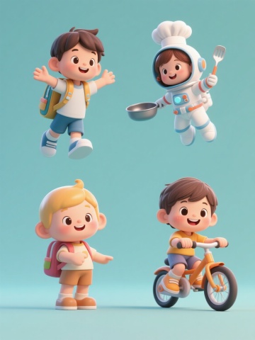 软3D风格插画,纯色背景,四位不同穿搭的购物人物系列素材集合,规整排布。每个角色均呈现圆润可爱的3D建模质感,光影柔和,边缘平滑,色彩鲜明且整体色调变换统一。第一位角色穿着黄色连衣裙与帽子,坐在购物车内手持手机,周围散落购物袋与饮品;第二位角色身着休闲牛仔套装,手提多个购物袋,面带微笑向前迈步;第三位角色穿着时尚运动服,单手推着满载商品的购物车,另一只手举起展示商品;第四位角色打扮成优雅淑女风,提着精致购物篮,身旁漂浮着化妆品与服饰礼盒。所有人物姿态生动活泼,购物元素丰富多样,整体构图平衡对称,画面充满欢快购物氛围,无任何文字、LOGO、电话地址及二维码。
