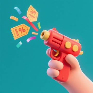 画面中心是一只紫色的手托举着一个大大的粉红色的钱包,钱包上有冒出一个对话框,里面写着“-50%”,钱包上粘有一些红色爱心和金币的贴纸。四周围绕着几个星星,红色背景。