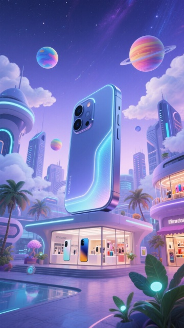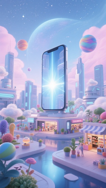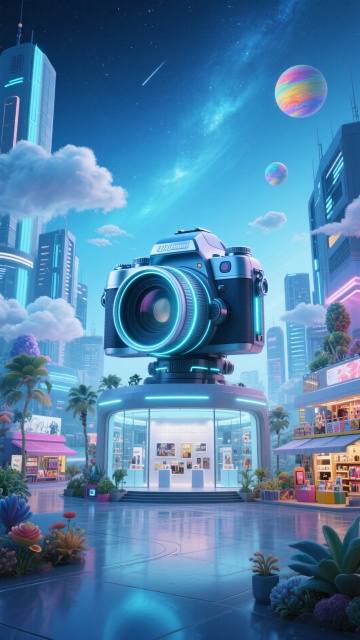 画面中心是巨型建筑(建筑细节:和相机外形相近,发光效果)周围有未来感城市建筑、彩色星球、云、商品店铺、奇特植物,背景是星空,低饱和蓝粉色调