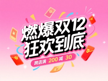 喜庆热烈的双12促销海报,采用扁平风与描边风结合,大字风标题突出“燃爆双12 狂欢到底”,搭配红包元素与几何图形,营造卡通感与波普艺术氛围,粒子风点缀增强动感,传递强烈促销感。