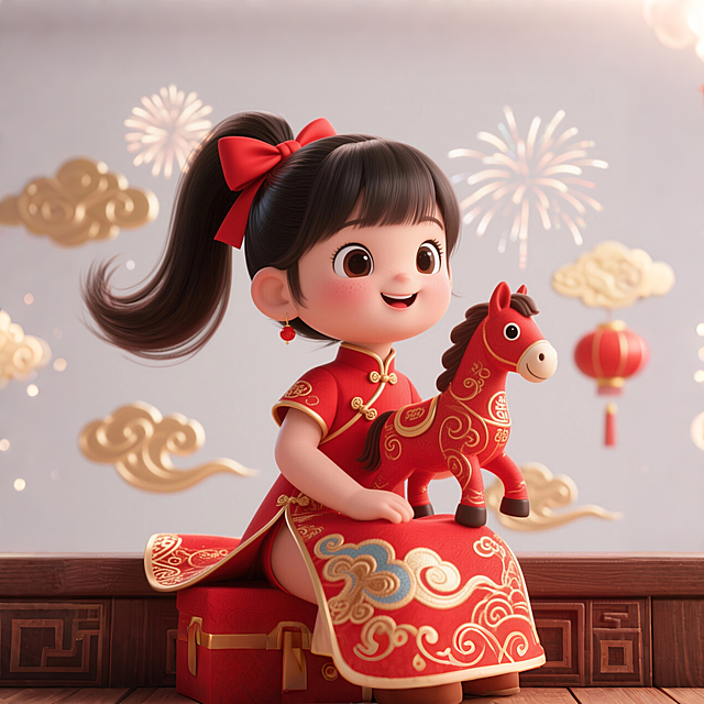 C4D 建模风格,2026 新年恭贺主题 IP 形象,可爱元气的高马尾小女孩,齐刘海 高扎红色丝带蝴蝶结马尾,灵动杏眼笑眼弯弯,脸颊带喜庆红晕,身穿喜庆正红色国风新中式连衣裙,衣摆点缀金色祥云纹样与马纹刺绣,融合生肖马元素 —— 女孩肩头趴伏一只萌态卡通小马,小马通体赤红配鎏金纹路,与女孩造型呼应,整体造型圆润饱满,3D 立体质感,光影通透柔和,金属质感与布艺质感细腻,新年喜庆氛围拉满,色彩以大红 鎏金为主色调,背景点缀浅金祥云与新年烟花,构图居中,高清 8K,细节拉满,IP 形象商用级设计,简洁干净背景,萌系治愈风格详情