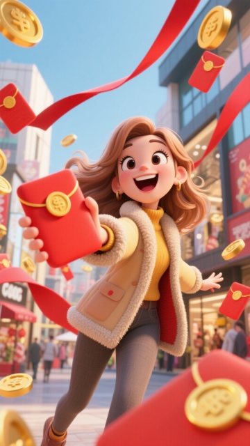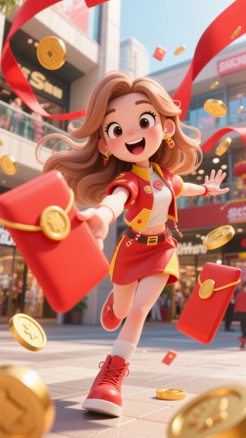 软3D风卡通少女手持红包,喜庆感十足,国潮元素与鎏金质感融合,金币飘飞,节日氛围浓厚。