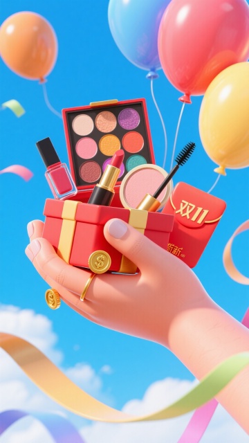 短发女性,戴蓝墨镜、金耳环,穿白背心、银短裙、银高跟鞋,坐粉橙相间礼盒上,手持多色购物袋。周围散落红包、口红、眼影盘、小礼盒等元素,橙色渐变背景