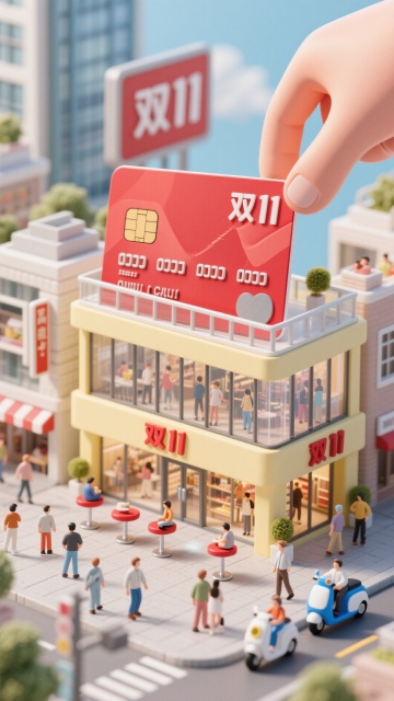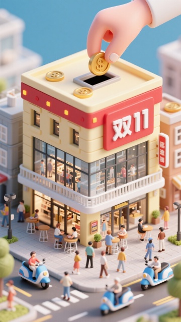 3D霓虹都市夜景,鎏金大字闪耀,电光穿街而过,金币与优惠券飞舞,融合city pop与未来科技感,营造极致双十一促销狂欢氛围。