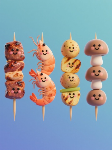 四个不同整体色彩的系列素材集合,每个素材均为规整排布的单个卡通形象,保持圆润可爱的3D立体风格,明亮鲜艳的纯色背景,角色具有拟人化的表情和动态,光滑的表面质感,高光和阴影的细节处理,第一幅为橙色小龙虾举着啤酒杯,第二幅为黄色炸鸡举着可乐杯,第三幅为绿色牛油果举着果汁杯,第四幅为紫色葡萄举着葡萄酒杯,所有角色均面带微笑,构图统一,形成风格一致的美食饮品主题系列插画。
