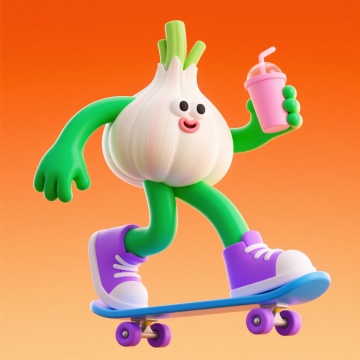 软3D风格的大蒜拟人角色,手持奶茶滑板酷炫登场,充满可爱与趣味感,卡通造型搭配明亮色彩,节日氛围轻松活泼。