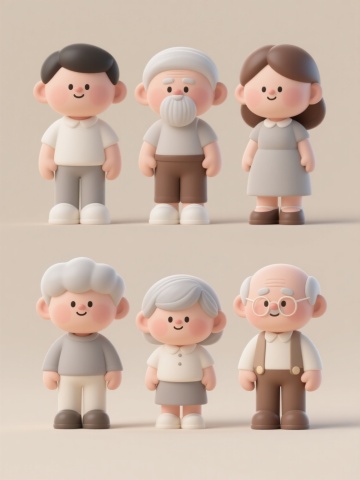 系列集合海报,六个完全不同造型和角度的3D卡通人物,有男有女、有老有少,均保持圆润可爱的Q版风格,柔和明亮的光影,细腻光滑的3D模型质感,主色调为米白色、灰色和棕色,纯色背景,规整排布成两行三列,每个人物姿态各异且自然生动,整体视觉层级清晰,信息传达高效,设计感十足。